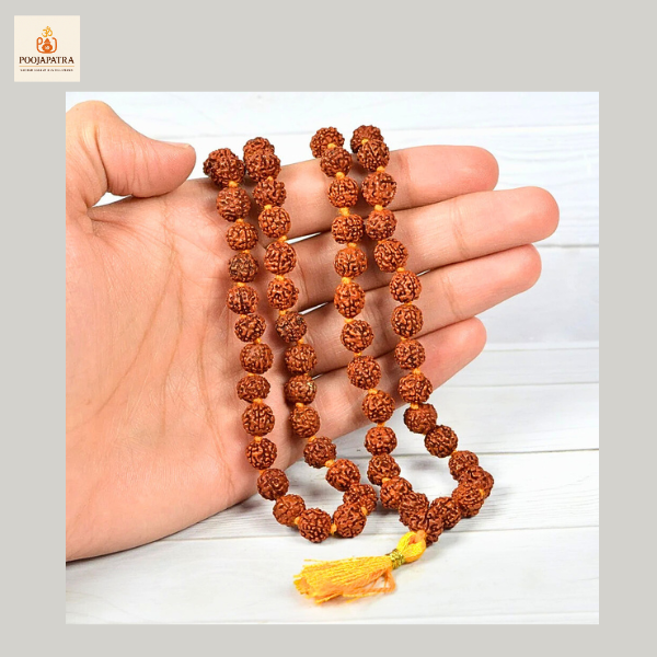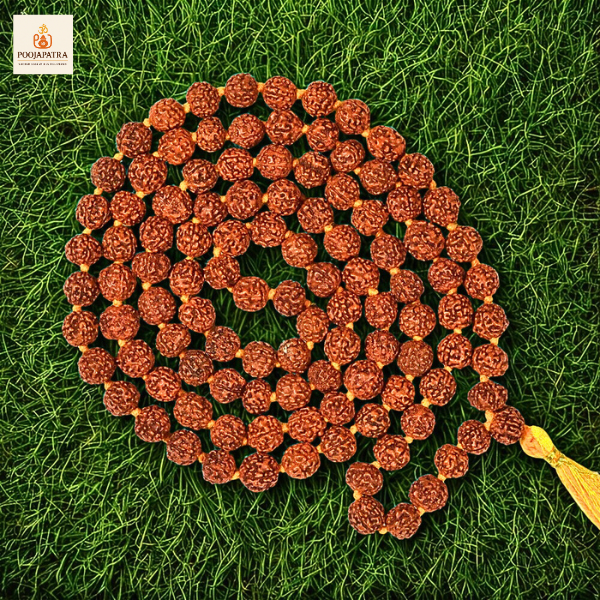 पंचमुखी रुद्राक्ष के दाने – प्रत्येक दाना पाँच मुखों (faces) वाला होता है, जो पंचमहाभूत (पाँच तत्व) और भगवान शिव का प्रतीक है।