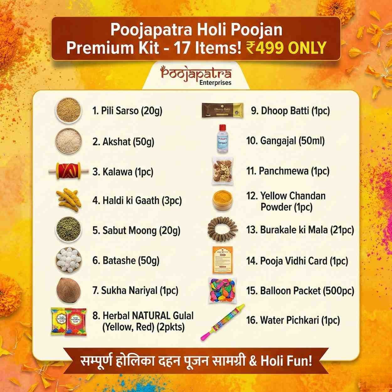 Holi sirf rangon ka tyohar nahi, balki shradhha aur burai par achhai ki jeet ka din hai. Holika Dahan ki pooja ke liye har ek item ka apna mahatva hota hai, aur aksar hum kuch na kuch bhool jate hain. Isiliye PoojaPatra Enterprises ne taiyaar ki hai ye Premium Holi Kit.
